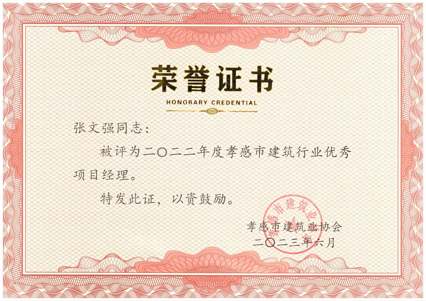 2023年度孝感市建筑行業(yè)優(yōu)秀項目經理-秦銳...祝賀秦銳同志被評為2023年度孝感市建筑行業(yè)優(yōu)秀項目經理...